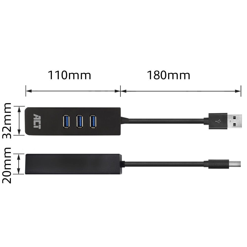 ACT USB Hub 3.2 3x USB-A ethernet, zwart